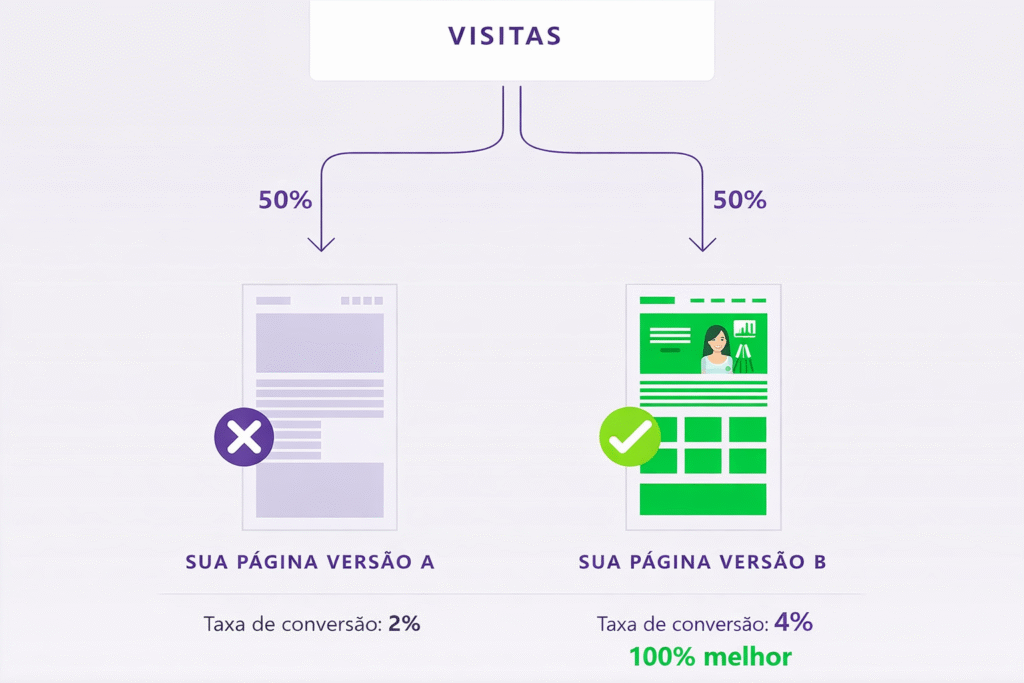 É aqui que entra o Teste A/B. Em vez de confiar em intuição ou em “boas práticas” que funcionaram para outra empresa, você coloca sua hipótese à prova com dados reais do seu público. Um Teste A/B (também chamado de split test) é um experimento controlado em que você compara duas versões de uma página ou elemento para descobrir qual gera mais conversões.
